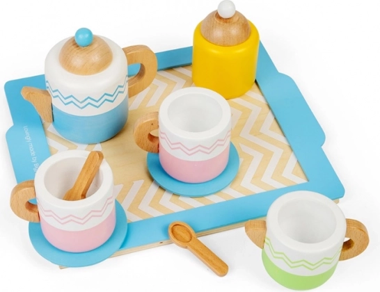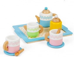 Ez a gazdag teáskészlet mindent tartalmaz, amire a kis házigazdáknak szükségük lehet – a csészéktől a teáskannáig és a tálcáig. A minőségi, fából készült kivitel, a sima felület és a finom pasztell színek játékra csábítanak, amely fejleszti a képzelőerőt, a kommunikációt és az alapvető étkezési szabályok elsajátítását.