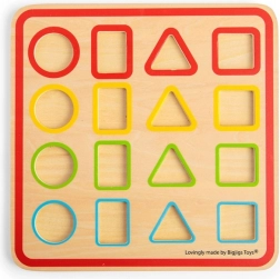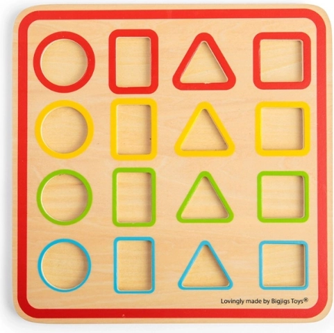 A készlet tartalmaz egy masszív alaplapot és 16 fa elemet különböző alakokkal és színekkel. A 25 × 25 × 0,9 cm-es, kompakt méretű tábla jól illik a gyerekasztalra és utazáshoz is, és könnyen elpakolható.