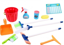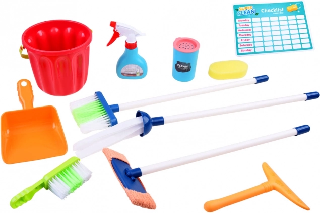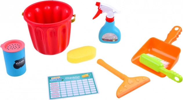 A készlet mindent tartalmaz, amire a kis segítőnek szüksége lehet: vödör, felmosó, seprű, lapát, kefe, szivacs és további kiegészítők, amelyek ösztönzik a képzelőerőt és támogatják az aktív játékot. Vidám színek és élethű megjelenés vonzza a figyelmet és mindennapos játékra hív.