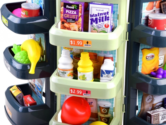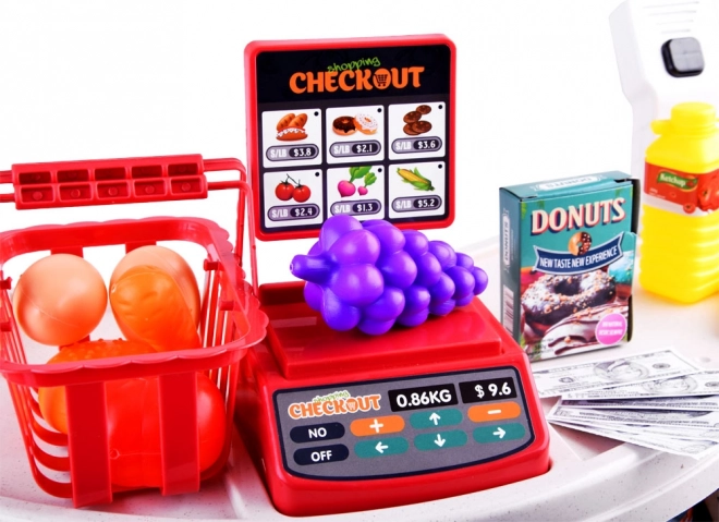 A gyerekek kipróbálhatják az igazi vásárlást – a szkenner pittyenése, a „bankjegyekkel” való fizetés és az áru kiadása a pultról fokozza a játék hitelességét.