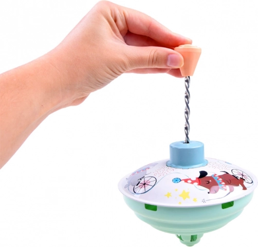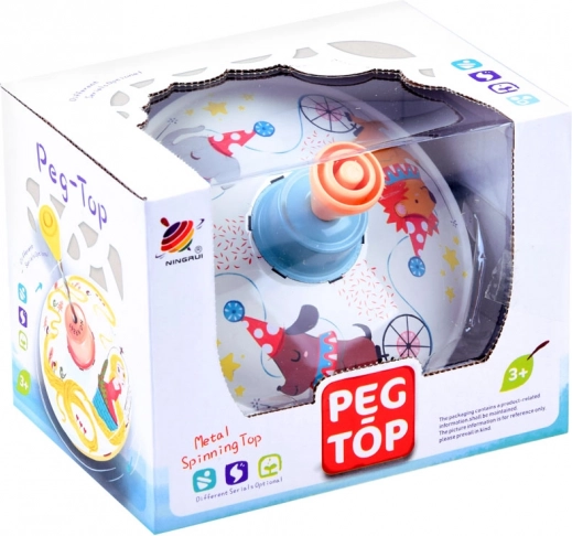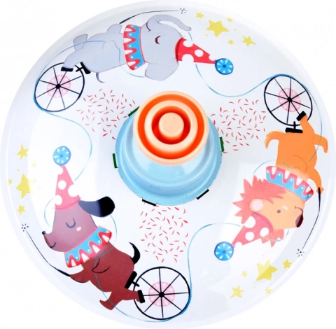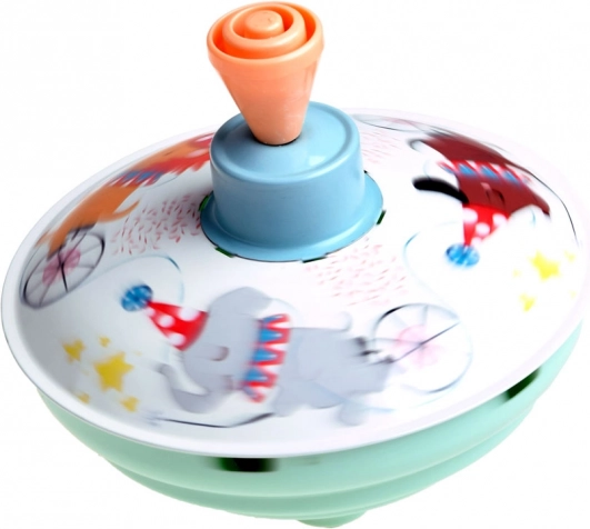 A játékfelületet játékos, cirkuszi témájú állatfigurák díszítik, amelyek fejlesztik a fantáziát és a vizuális észlelést. A fém test és a műanyag fogantyú kombinációja tartósságot biztosít a mindennapos használathoz. A pörgettyű kiváló a finommotorika, a szem–kéz koordináció és a türelem fejlesztésére.