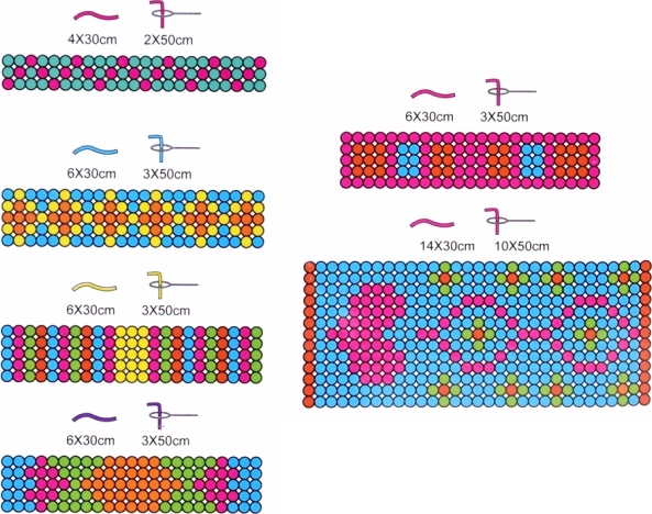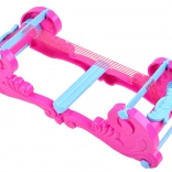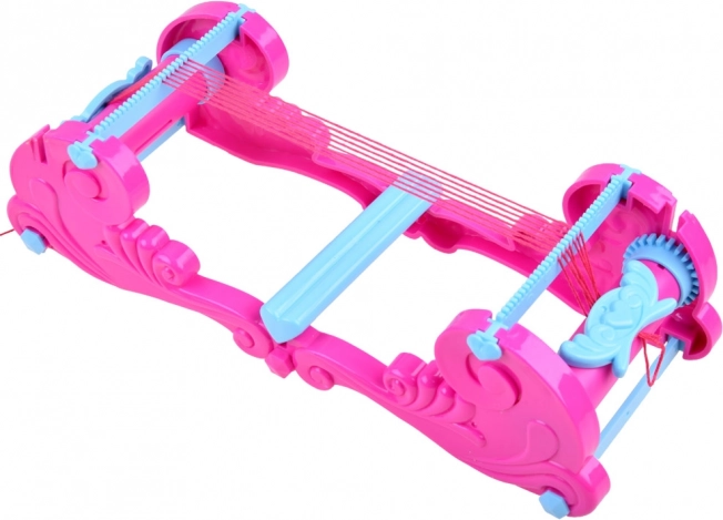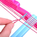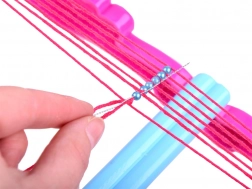 A rózsaszín-kék állvány erősen a helyén tartja a szálakat, megkönnyítve a gyöngyfűzést és az egyenletes minták készítését.