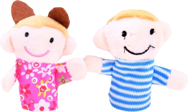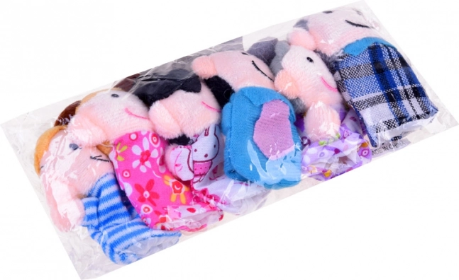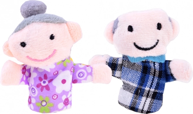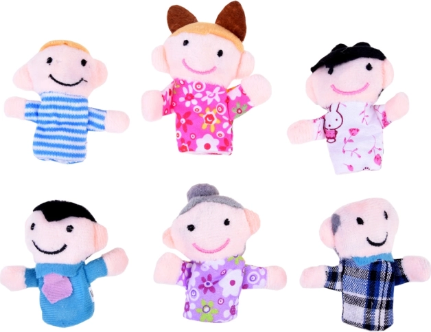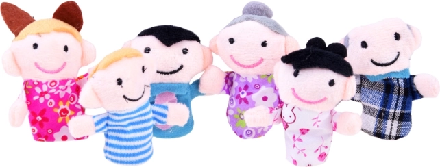 A készlet hat ujjbábot tartalmaz: nagypapát, nagymamát, anyukát, apukát, egy fiút és egy lányt.