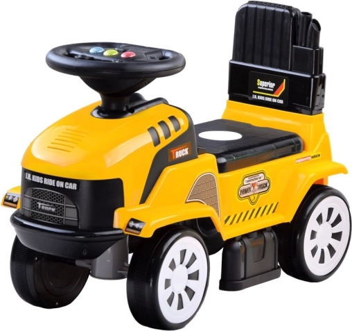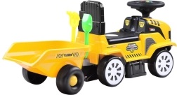 Szórakoztató, traktor formájú gyerek lábbal hajtható jármű levehető utánfutóval, amely örömet okoz a kis sofőröknek otthon és a kertben is. Kínál dallamokat és fényhatásokat, forgatható első kerekeket, tágas tárolórekeszt az ülés alatt és ergonomikus kialakítást háttámlával a kényelmes és biztonságos utazásért. A csomag része a gereblye és a lapát a kreatív játékhoz.