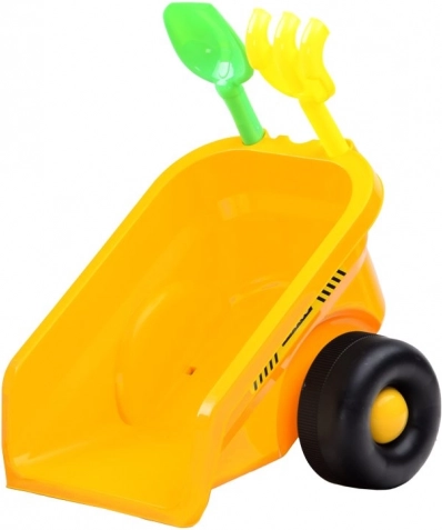 A levehető utánfutó tartókkal rendelkezik a mellékelt kis gereblye és lapát tárolásához, támogatva a fantáziát és az építkezős vagy homokozós játékot.