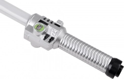 Ergonomikus, ezüstszínű markolat gombbal a fény és hang aktiválásához, biztos fogással és intuitív használattal.