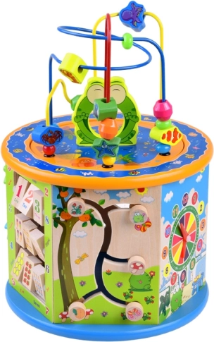 Ez a fa oktató kocka széleskörű tevékenységeket kínál, amelyek segítik gyermekét új készségek és ismeretek elsajátításában. Számos funkciót tartalmaz, beleértve a gyöngylabirintust, színes számolóeszközt és alakzati kivágásokat. Minden elem a gyermekek kis kezeire lett tervezve, ami biztonságos és kényelmes játékot biztosít.