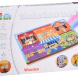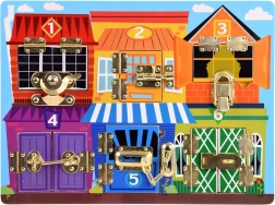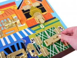 A zárak és ajtók kezelése erősíti az ujjakat, a koordinációt és a mozdulatok pontosságát. A gyerekek mindkét kezüket használják, és türelmet tanulnak az egyszerű feladatok megoldása közben.