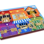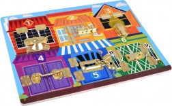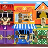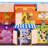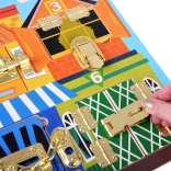 Ez az interaktív manipulációs tábla rengeteg szórakozást és tanulást kínál egyben. Minden színes házikó számmal van jelölve, és az ajtó mögött a számnak megfelelő mennyiségű állatot rejt. A gyerekek így gyakorolják a számolást, a színfelismerést és a logikus gondolkodást, miközben a különféle zárak kinyitása erősíti a finommotorikát és a szem–kéz koordinációt.