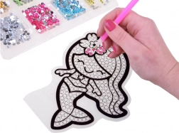 A Gyémántfestés Sea Friends készlet segítségével a gyerekek csillogó képeket készíthetnek tengeri barátokról. Csak le kell húzni a védőfóliát, a viaszos applikátorral felvenni a kristályt, majd a színek szerint a ragasztós matricára vagy sablonra helyezni. Ha egy kristály rossz helyre kerül, a száradás előtt könnyen áthelyezhető.