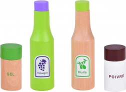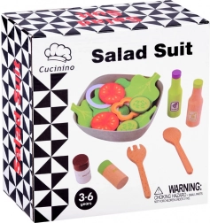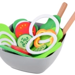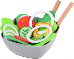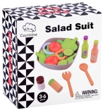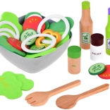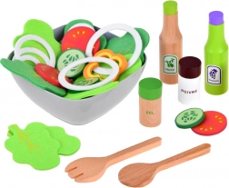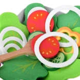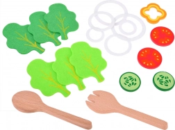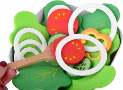 Textil zöldségszeletek, fa fűszertartók és tálalókanalak segítségével a gyerekek „igazi” salátát készíthetnek, miközben kibontakoztatják konyhai fantáziájukat.