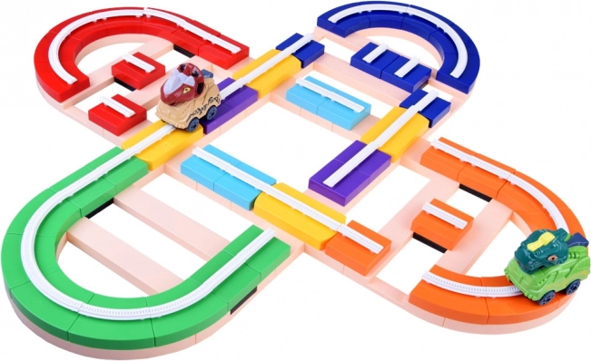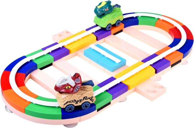 A dinoszauruszos versenypálya építőkészlet lehetőséget ad a gyerekeknek, hogy fantáziájuk szerint rakják össze és alakítsák a nyomvonalat. A pályaelemeket egyszerűen egymásba pattintod, és asztalon vagy falon is vezetheted – a mellékelt tapadókorongok sima felületeken, például üvegen jól tartanak. A kisautók a sínes vezetésnek köszönhetően vízszintesen és függőlegesen is biztonságosan haladnak, és a blokkok megfelelő elforgatásával könnyen változtatható a haladási irány.