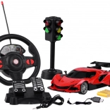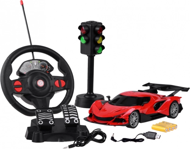 - Teljes szett: autó, kormány, pedálok, jelzőlámpa, akkumulátor, USB kábel.