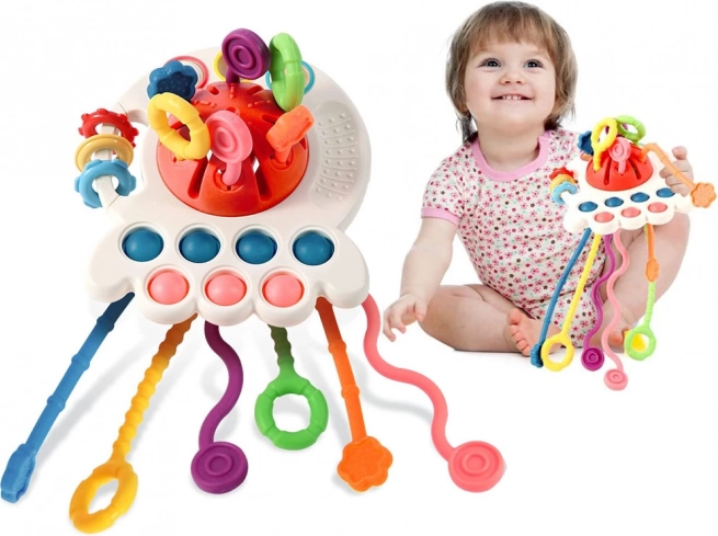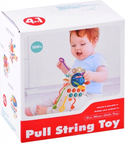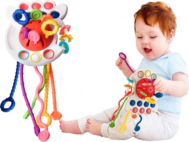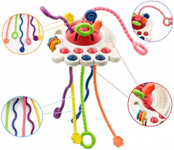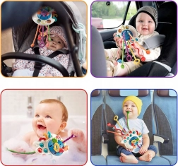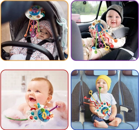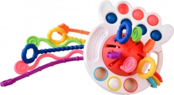 A speciálisan tervezett rágóka hat texturált húrral rendelkezik, amelyek húzáskor különféle hangokat és rezgéseket produkálnak. Ez a funkció segíti a gyermek fogásának gyakorlását és fejleszti a motoros készségeket.