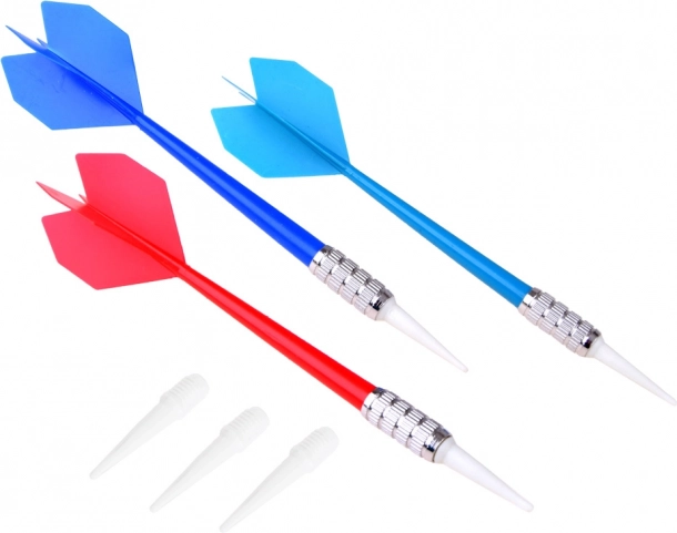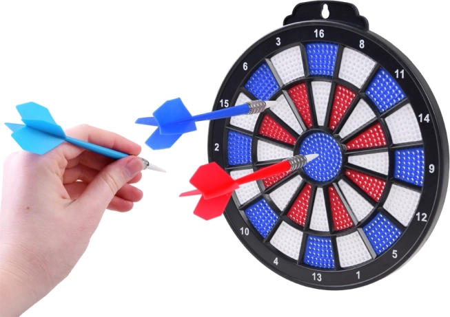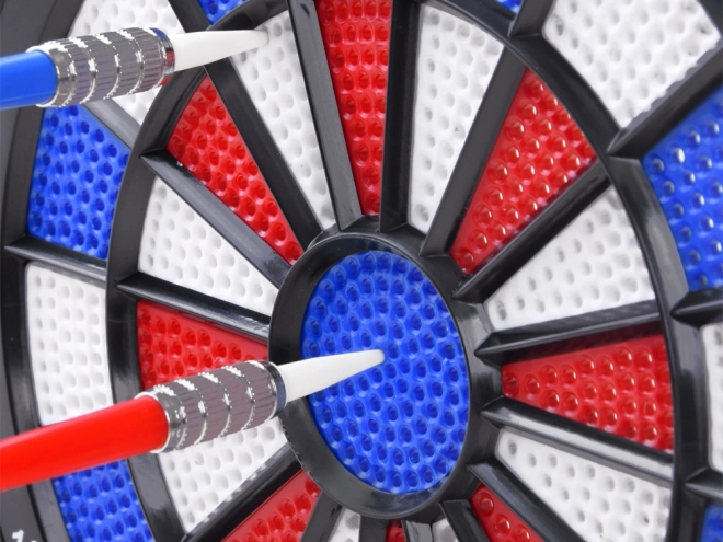A dart tábla rekreációs használatra készült, piros, kék és fehér szegmensekkel a pontos célzás és pontozás érdekében.