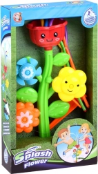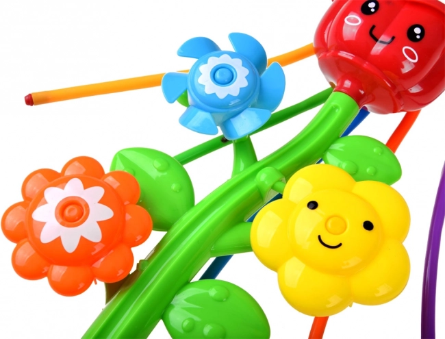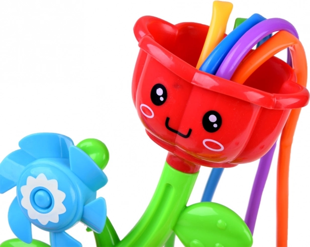 Színes műanyag dizájn, vidám virágokkal, amelyek a víz áramlása közben forognak, biztosítva az interaktív játékot.