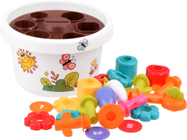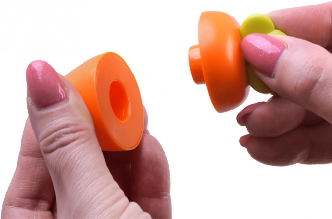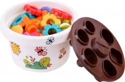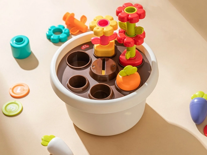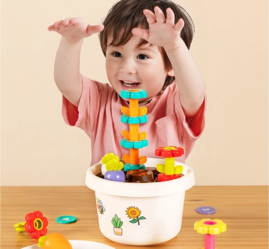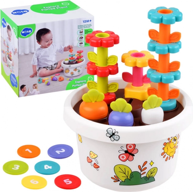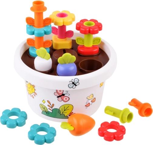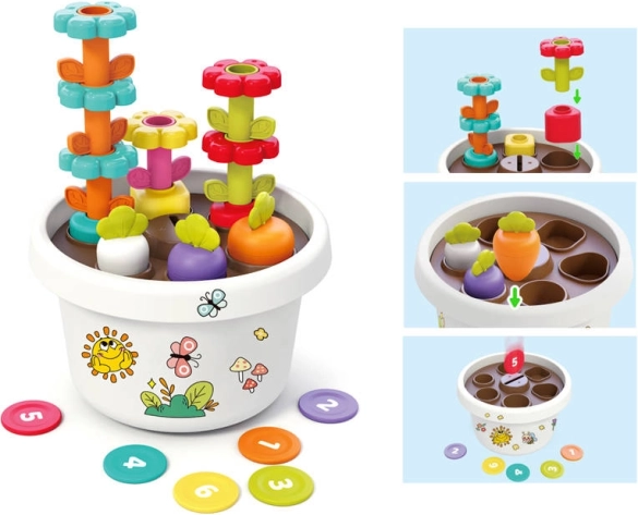 Minden játékdarab különböző lehetőségeket kínál a gyerekeknek, hogy megismerkedjenek az alapszínekkel és formákkal. Az összes darab könnyen elhelyezhető a virágtartóban, ami helytakarékos és rendet tart.