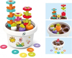 A virágtartó alapjának közepén egy lyuk található a zsetonok behelyezésére, ami javítja a kéz-szem koordinációt. A készlet tartalmaz színes matricákat is a virágtartó díszítésére, amely fejleszti a gyerekek kreativitását.