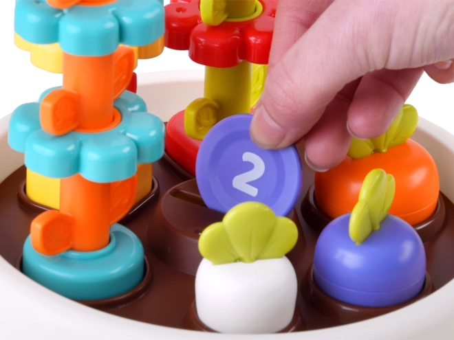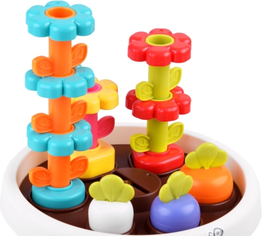 A játék támogatja a gyermek finommotorikus képességeit az interaktív elemek, például a halmozható virágok és színes zsetonok révén.