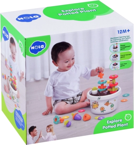 Hola Edukációs Virágtartó kiváló kis kertészeknek és támogatja a motorikus fejlődést, a színek és formák megkülönböztetését a legkisebbeknél. A készlet tartalmaz 3 mágneses répát, színes virágokat és számos zsetont, amelyek támogatják a logikus gondolkodást és koordinációt. Mindez magas minőségű műanyagból készült, ami biztonságot nyújt a játék során.