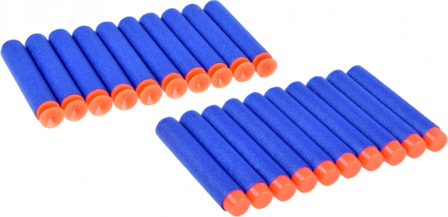 A csomagban 20 kék lövedék található narancssárga heggyel. Puha anyag a szórakozáshoz otthon és a kertben.
