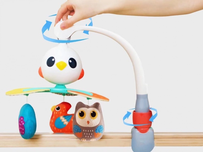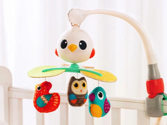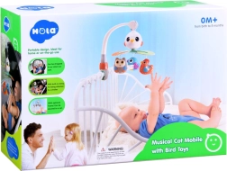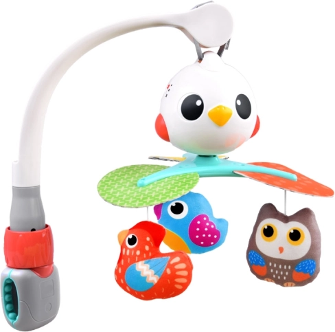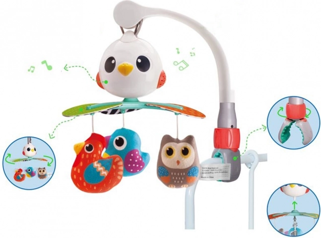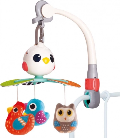 Ez a gyönyörű gyerek körhinta úgy lett tervezve, hogy stimulálja a gyermek vizuális, hallási és tapintási érzékeit. A kipróbált dallamok és kellemes zenék biztosítják, hogy a baba elégedett és megnyugodott legyen. A forgó szerkezet színes madár formájú függő játékokkal van kiegészítve, amelyek vonzzák a megfogásra és érintésre.
