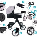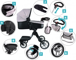 - a babakocsi stabil és a forgatható kerekek kényelmes vezetést és kényelmet biztosítanak játék közben
