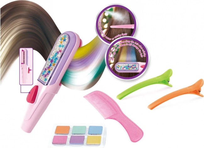 Fedezze fel a frizuraváltás varázsát ezzel a hajkréta készlettel, amely örömet okoz minden lánynak. A készlet tartalmazza az összes szükséges eszközt az új, színes frizurák alkotásához. A készlet hat színű krétát tartalmaz: lila, narancssárga, zöld, kék, rózsaszín és türkiz, valamint egy applikátort és fésűt a színezéshez.