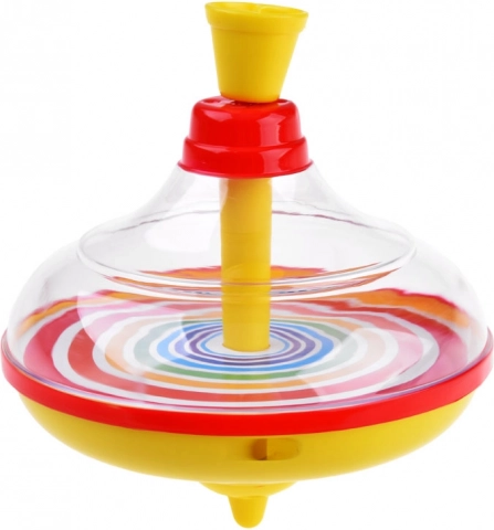 Ez az időtálló forgójáték generációkon át örömet szerez. Néhányszor nyomja le a felső dugattyút, és a pörgettyű saját tengelye körül forogni kezd – a színes koncentrikus gyűrűk lenyűgöző szivárványos hatást keltenek, amely megbízhatóan leköti a gyerekek figyelmét. Forgás közben a pörgettyű jellegzetes hangot ad, ami fokozza a szórakozást.