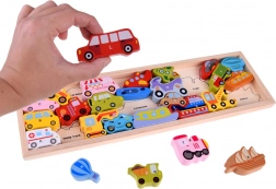 A masszív fa kivitelnek köszönhetően a darabok kellemes fogásúak és biztonságosak. A gyerekek kirakhatják az elemeket az alapba, tornyokat építhetnek, számolhatnak, és történeteket alkothatnak kedvenc járműveikkel.