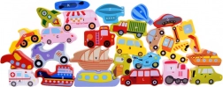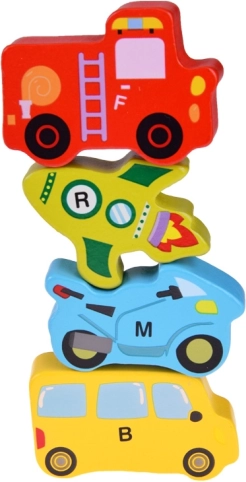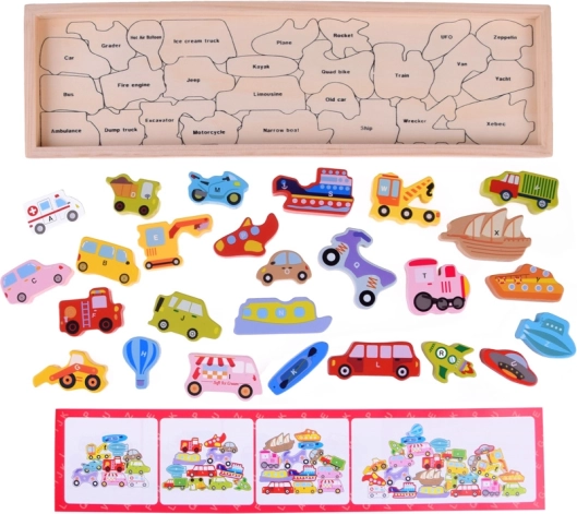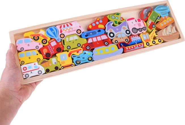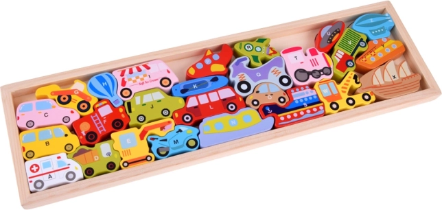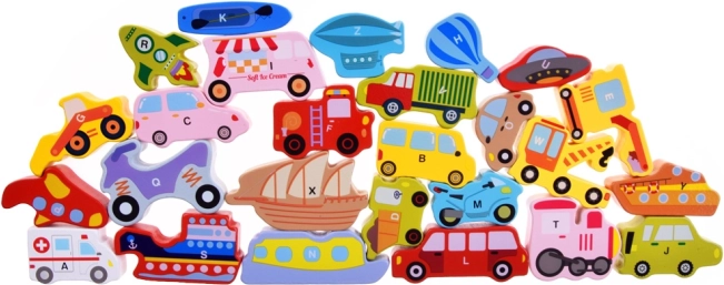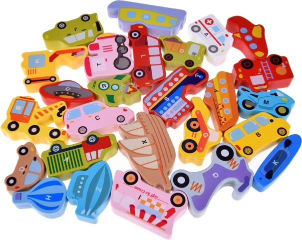 A fa szett 27 színes járművet tartalmaz – autót, buszt, tűzoltóautót, valamint például hőlégballont, hajót, rakétát és léghajót – és egy feliratozott fa alapot. Minden darabon A–Z betű (egy különleges motívummal együtt) található, ami játékos formában segíti az ábécé tanulását és bővíti a szókincset.