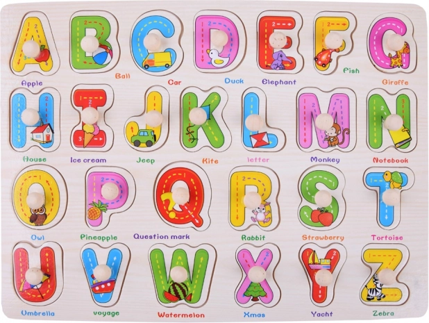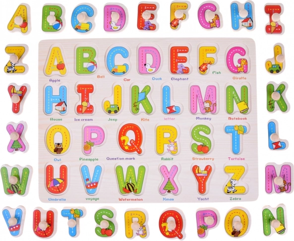 Ez a fa ábécé remek segítőtárs az első betűismerkedésnél. A nagy, színes elemek fa fogantyúkkal könnyen kivehetők és visszahelyezhetők, ami természetes módon fejleszti a szem–kéz koordinációt és a finommotorikát. Minden betűhöz tartozik egy kép és egy angol szó (pl. A – Apple, B – Ball, R – Rabbit), így a gyerekek egyszerre tanulják a betűket és az alapvető szókincset.