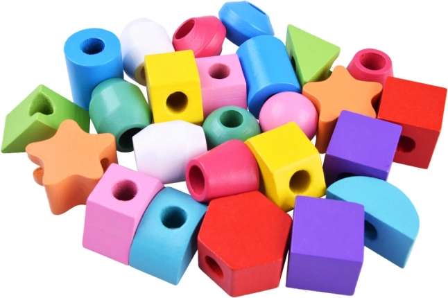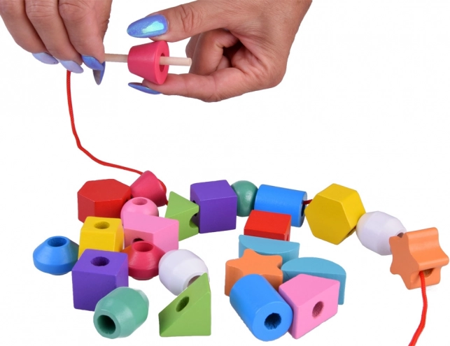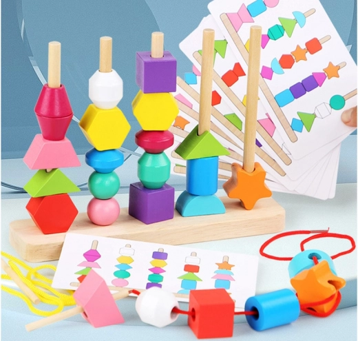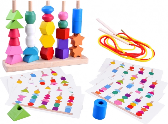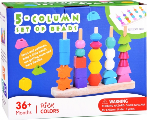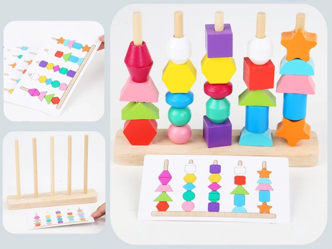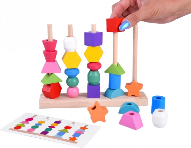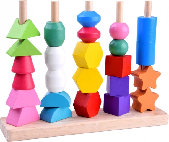 Ez a sokoldalú fa játék kétféle játékmódot kínál: színes gyöngyök felfűzését zsinórokra, valamint formák elhelyezését egy öt tüskéből álló állványra a minták szerint. Az élénk színek és a változatos geometriai formák természetes módon támogatják a látás, a tapintás és a térérzékelés fejlődését.