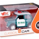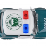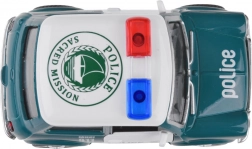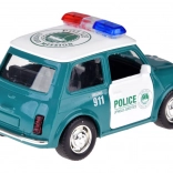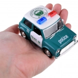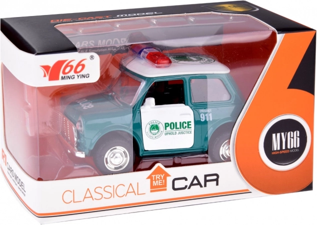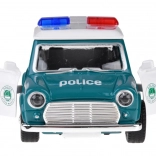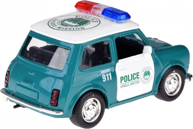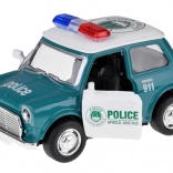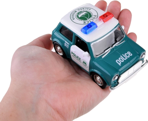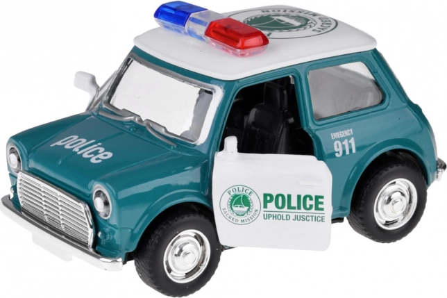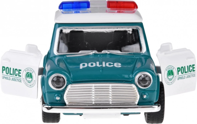 Miniatűr rendőrautó klasszikus dizájnnal és élethű részletekkel, beleértve a piros-kék fényhidat és a jellegzetes rendőrségi feliratokat. A fém karosszéria és a gumis kerekek növelik a tartósságot és a tapadást, így az autó ideális a mindennapi játékhoz otthon és útközben is.