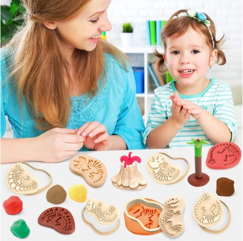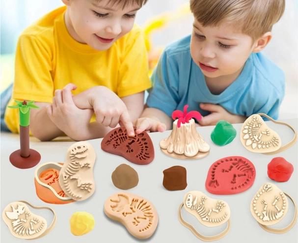 A formák és a kiszúrók segítségével a gyerekek könnyedén nyomhatnak csontvázakat és dinoszaurusz-lábnyomokat a gyurmába. Játékos módja az őskor megismerésének és a képzelet fejlesztésének.