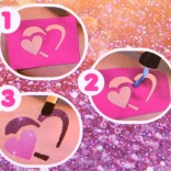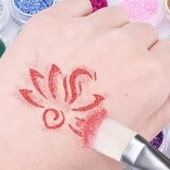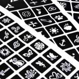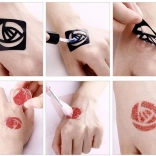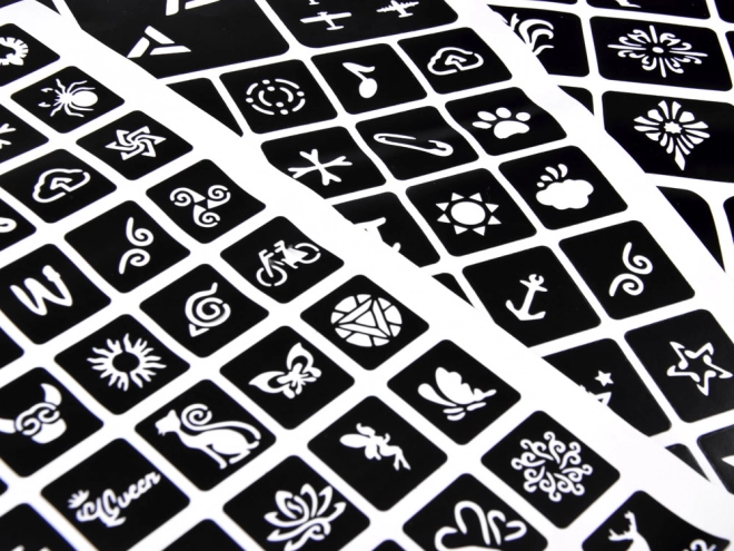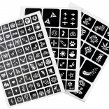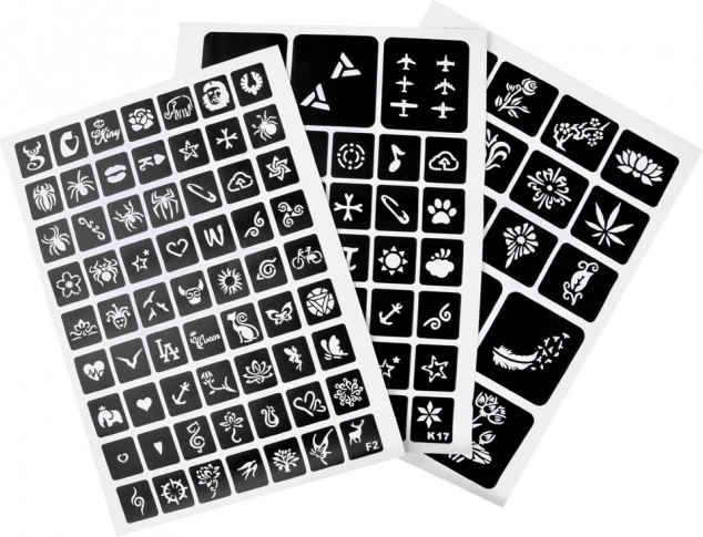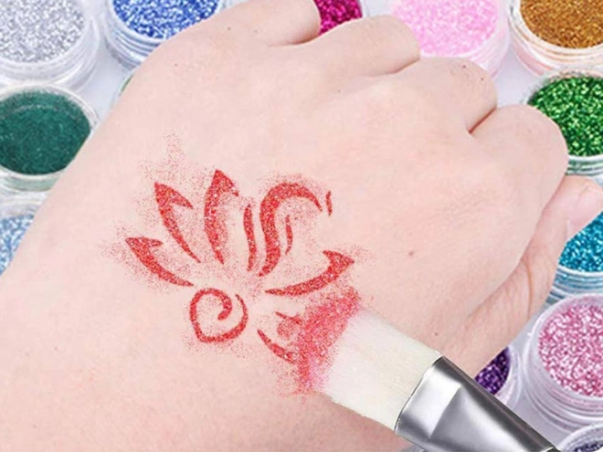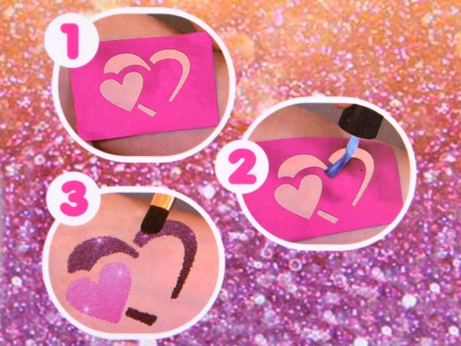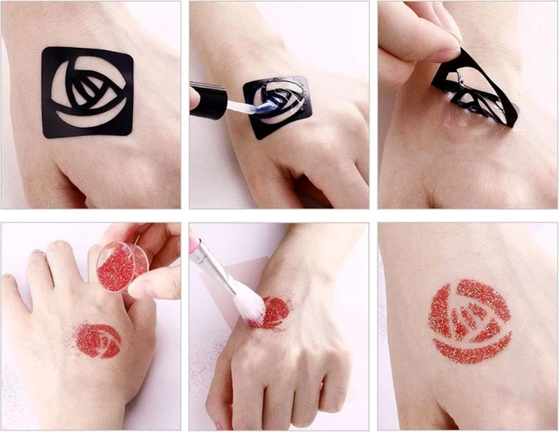 Használat: Válaszd ki a sablont és helyezd a tiszta bőrre, vidd fel a mintát ragasztóval, húzd le a sablont, szórd rá a csillám színeket – és kész!