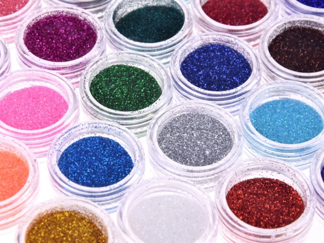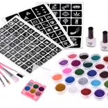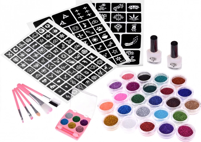A készlet mindent tartalmaz a ragyogó csillámtetoválások elkészítéséhez, 24 különböző csillámszínnel.