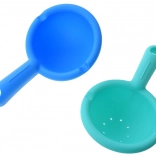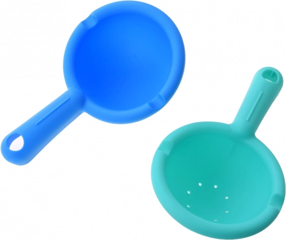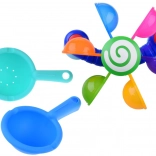 A gyerek önthet vizet a játékra zuhanyfejjel, lapáttal vagy szitával, ami órákig tartó szórakozást és tanulást kínál.