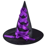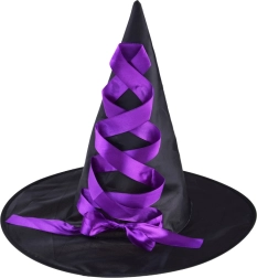 A fekete boszorkánykalapot lila szaténszalag díszíti. A stabil forma és az erős színkontraszt varázslatos megjelenést kölcsönöz.