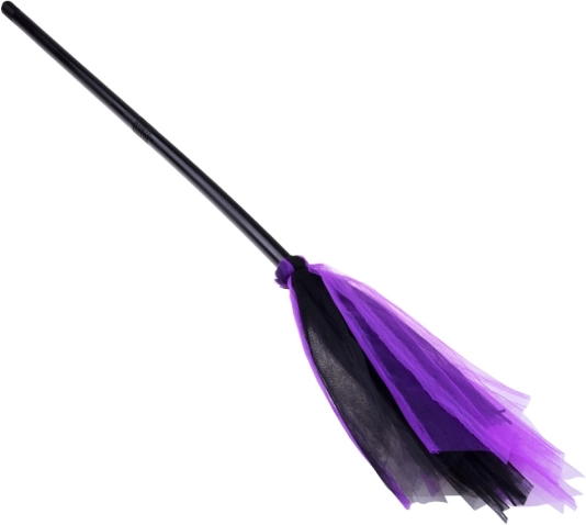 Könnyű seprű műanyag markolattal és fekete–lila véggel, ideális kellék farsangi és halloweeni jelmezekhez.