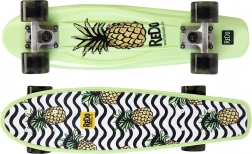 Ez a gördeszka élénk megjelenéséről ismert, ananász grafikákkal és hullámos fekete-fehér mintákkal, amely szórakoztató és figyelemfelkeltő megjelenést kölcsönöz.