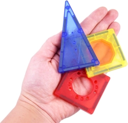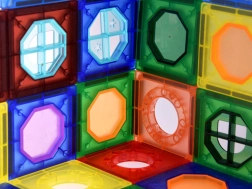 Az építőkészlet különböző színes paneleket és formákat tartalmaz, amelyek segítik a gyerekek formák és színek felismerési képességének fejlesztését.