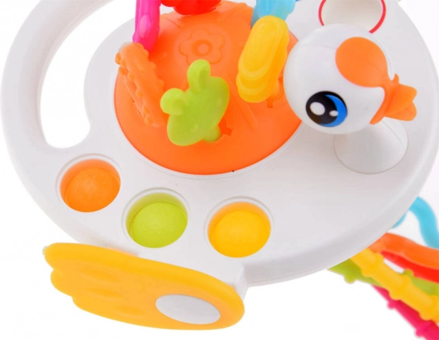 A bájos, szenzoros játék és rágóka hattyú alakban már az első napoktól örömet szerez a babáknak. Különféle textúrákat, hanggal és finom rezgéssel ellátott húzható zsinórokat, puha gombokat, valamint egy csúsztatható elemet kínál a finommotorika fejlesztéséhez. Kompakt mérete és biztonságosan lekerekített élei ideális játékká teszik utazáshoz.
