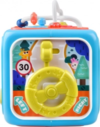 Színes interaktív kocka 18 hónapos kortól, amely egyetlen játékban ötvözi a kis zongorát, a gyöngyös útvesztőt, a formaválogatót, a forgó kerekeket, az idő tanulását és a kormánykereket. Támogatja a finommotorikát, a kéz–szem koordinációt, a formák és színek felismerését, valamint az érzékszervi fejlődést. A kompakt méret utazáshoz ideális, a vidám dallamok és hangok hosszan lekötik a figyelmet.