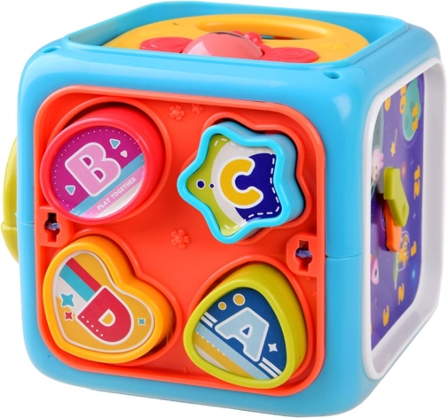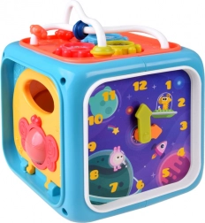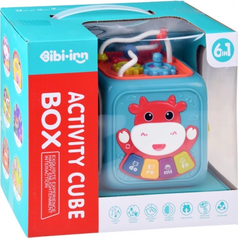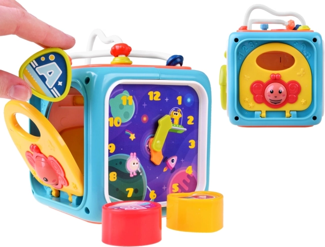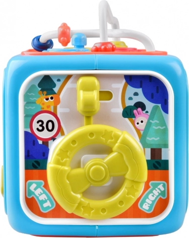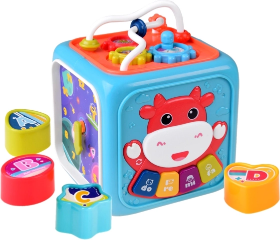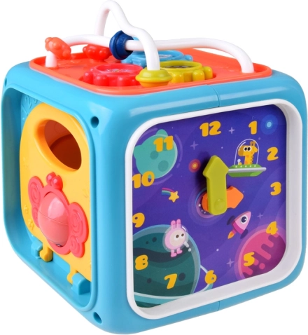 Ez a multifunkciós aktivitási kocka játékos módon fejleszti a gyerekek készségeit. A gyerekek a gyöngyös útvesztőn és a fogaskerekeken manipulációs készségeiket gyakorolják, a válogatónak köszönhetően megtanulják a formák szétválogatását, a mozgatható mutatós órával pedig felfedezhetik a napi rutint és az idővel való első ismerkedést.