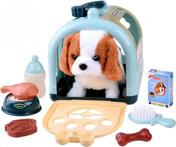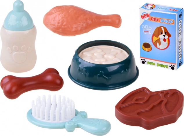 - Plüss kutyus, hordozható szállító, kefe, etetőpalack, tál imitált eledellel, csont, csirkecomb, steak, eledeles doboz imitációval, matricák