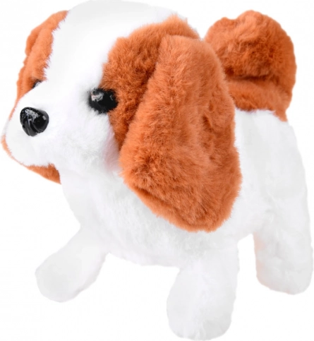 A kutyus előre sétál, ugat, csóválja a farkát, és fejsimogatásra gyengéd kölyökkutya-hangokat ad ki – ideális az interaktív játékhoz.