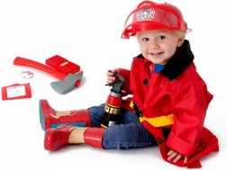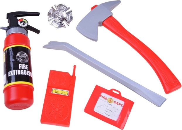 Balta, feszítővas, rádió, jelvény és tűzoltó igazolvány – a kis megmentőnek minden megvan a valósághű játékhoz.