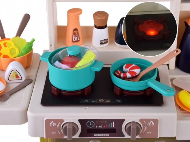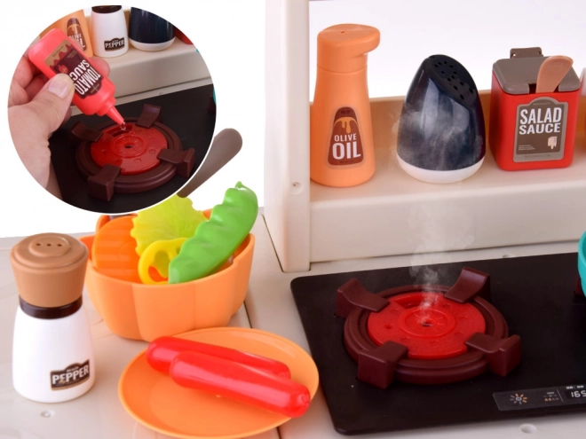 A gomb elfordítása után a főzőlapok felgyulladnak, főzési hangok hallatszanak, és víz feltöltése után az egyik égőből biztonságos gőz száll fel. A gyerekek imádják a realisztikus élményt.