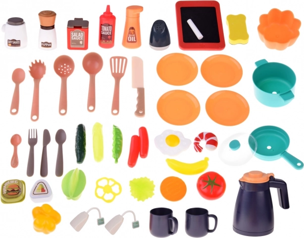 A 49 darabos kiegészítő készletnek köszönhetően a gyerekek könnyedén elkészítik a „napi menüt” – zöldségtől és tojástól a sushin és hamburgeren át egészen a fűszerekig. Nem hiányzik a fedeles fazék, a serpenyő, eszközök, tányérok, csészék és egy mini tábla krétával. A kialakítás tartós és biztonságos, minőségi műanyagból, nagy odafigyeléssel a részletekre.